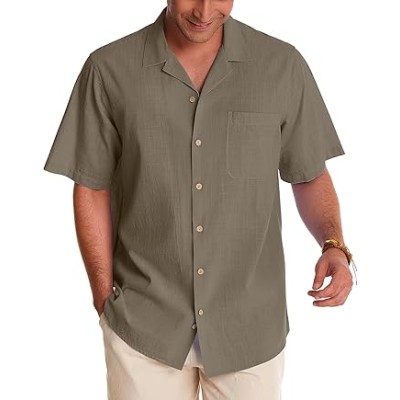 Cuban Linen Shirts for Men Short Sleeve Button Down Shirt Cotton Summer Beach Camp Vacation Hawaiian Shirts