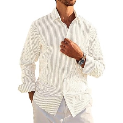 Mens Long Sleeve Button Down Shirt Striped Casual Cotton Business Summer Beach Wedding Dress Shirts