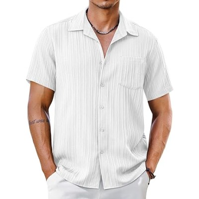 Men's Short Sleeve Button Down Shirts Summer Casual Textured Shirt Vacation Beach Wedding Shirts with Pocket