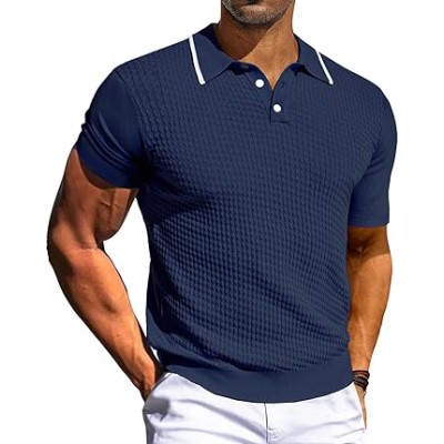 Men's Short Sleeve Knit Polo Shirts Waffle Texture Knit Shirt