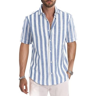 Men's Casual Stylish Short Sleeve Button-Up Striped Dress Shirts Cotton Beach Shirt